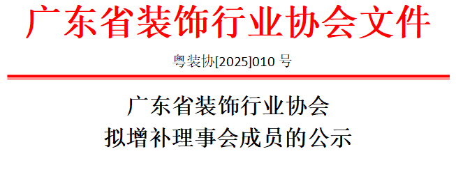 根據(jù)《廣東省裝飾行業(yè)章程》規(guī)定,現(xiàn)對(duì)自愿加入?yún)f(xié)會(huì)理事會(huì)的成員單位進(jìn)行公示,并在下一次會(huì)員大會(huì)選舉確認(rèn),請(qǐng)各位會(huì)員審議: